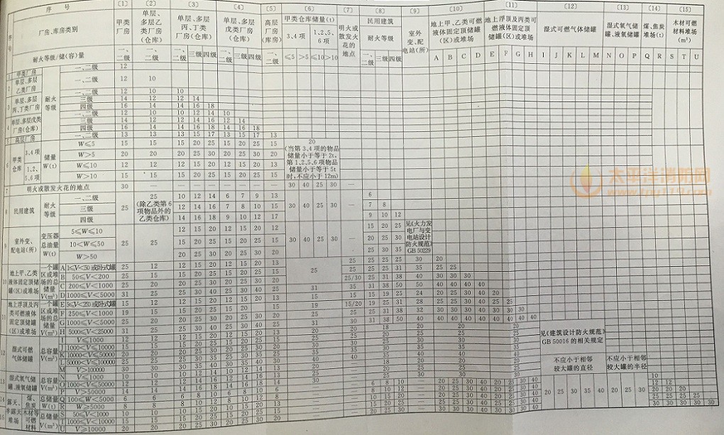 11 生产、使用和贮存物品的火灾危险性分类,建(构)筑物耐火等级的确定,建(构)筑物防火分区最大允许占地面积的有关规定,建(构)筑物设防火墙等防火措施,甲、乙、丙类液体的泵房及其装卸设施的防火间距以及本表中未列入的不常用的防火间距等,均按现行国家标准《建筑设计防火规范》GB 50016的有关规定执行。