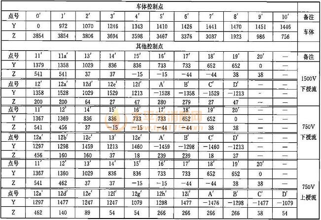 注:1 表中第0~11点是车体上的控制点;13~14点是轴箱簧下控制点;15~16点是车辆踏面控制点;17~18点是轮缘控制点;19~20点是齿轮箱控制点;m1~m6点是开门状态车门控制点;第12~12d点是受电靴工作状态控制点,12e~12f是受电靴脱靴状态控制点;A~D受电靴非工作状态控制点。其中11点水平方向对受流器及车体分别计算,并增加控制一个点,竖向按车底悬挂物计算;13点水平按照受流器计算,竖向按照簧下部分计算。