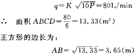 以喷头A、B、C、D为顶点的围合范围为正方形(见图10),每只喷头的25%水量喷洒在正方形ABCD内。根据喷头的流量系数、工作压力以及喷水强度,可以求出正方形ABCD的面积和喷头之间的距离。