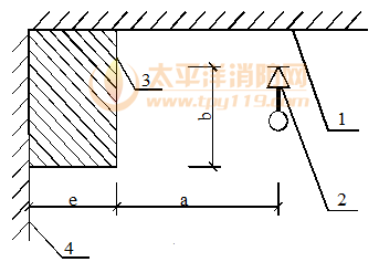 1-顶板 2-直立型喷头 3-靠墙障碍物 4-墙面