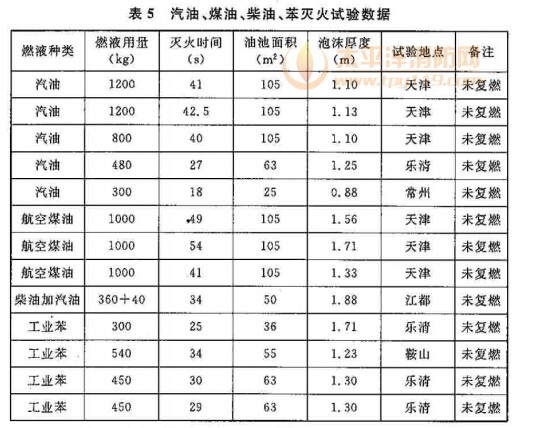 对于易燃、可燃液体火灾所需的泡沫淹没深度,我国对汽油、柴油、煤油和苯等做过的大量试验,积累的灭火试验数据见表5。表中所列试验,其油池面积、燃液种 类和牌号以及试验条件不尽相同,考虑到各种因素和工程应用中全淹没高倍数泡沫灭火系统可能用于更大面积的防护区,故对汽油、煤油、柴油和苯的泡沫淹没深度 规定取表中的最大值。对于没有试验数据的其他甲、乙、丙类液体,需由试验确定。